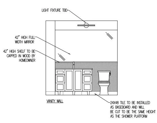 Below is the last elevation I created of the vanity wall in our ensuite, but after pricing some tile options out last year, I think we’re going to omit installing tile below the wood shelf.